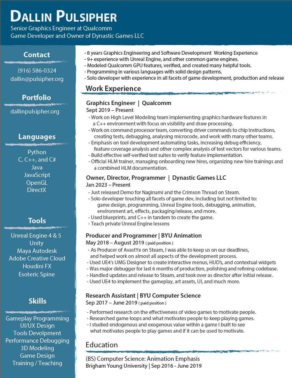 Additionally, I run an independent game studio on the side, Dynastic Games LLC. We just released a demo for our first game Naginami and the Crimson Thread. This gives me a creative outlet and keeps my software development skills up to date. I have extensive experience across various aspects of game development including game design, animation, programming, UX/UI design, art, level design, and more.